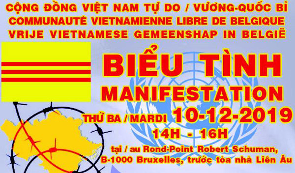 CỘNG ĐỒNG VIỆT NAM TỰ DO VƯƠNG QUỐC BỈ THƠ MỜI THAM DỰ BIỂU TÌNH QUỐC TẾ NHÂN QUYỀN 10/12/2019   Kính Thưa Quí Vị Đại Diện các Tổ Chức, Hội Đoàn và các Nhóm Sinh Hoạt tại các Quốc Gia Âu Châu, Kính Thưa Quí Vị Đồng Hương tại Âu Châu,   Thưa Quý Vị ,   Trên 44 năm qua kể từ ngày 30 tháng Tư 1975, Miền Nam Việt Nam thân yêu của chúng ta đã bị tập đoàn CSVN cưỡng chiếm,áp đặt một thể chế độc tài đảng trị vô nhân đạo trên dân tộc Việt Nam và bạo quyền CSVN đã không ngừng trù dập cầm tù những người dân yêu nước.   Cứ mỗi độ đông về vào ngày 10 tháng 12 hằng năm,như khắp mọi nơi trên thế giới, Cộng Đồng Việt Nam Tự Do tại Vương Quốc Bỉ vẫn bền lòng tham gia vào công cuộc đấu tranh yểm trợ những đồng bào trong nước đã hy sinh gióng lên tiếng nói đòi hòi Tự Do Dân Chủ Nhân Quyền cho Việt Nam .   Liên Âu và Việt Nam đã ký kết sơ bộ 2 Hiệp Định EVFTA và IPA, chỉ chờ Quốc Hội Âu Châu phê chuẩn vào đầu năm 2020.   Trên 70 Dân Biểu Âu Châu đã mạnh dạn lên tiếng cho rằng việc ký kết hai Hiệp Định này phải dựa trên căn bản Pháp Lý và Nhân Quyền.   Để tố cáo trước công luận Âu Châu và hậu thuẫn các vị Dân Biểu Âu Châu, Cộng Đồng Việt Nam Tự Do tại Vương Quốc Bỉ trân trọng kính mời Quí Vị tham gia cuộc Biểu Tình vào ngày:   Thứ Ba 10 Tháng 12 năm 2019 tại Quảng Trường ROND POINT SCHUMAN 1000 Bruxelles từ 14giờ đến 16giờ   Dẫu biết rằng là ngày trong tuần rất khó cho những người đi làm, nhưng đối với nỗi thống khổ của người dân trong nước, trước hiểm họa mất nước, 2 giờ đồng hồ của một năm trời, dưới bầu trời giá lạnh của thủ đô Âu Châu, sự hiện diện đông đảo của chúng ta sẽ mang lại một tiếng vang đối với Quốc Hội Âu Châu.   Chân thành cảm ơn sự hưởng ứng của Quý Vị   Thay mặt Ban Tổ Chức   Bs Nguyễn Quốc Bảo & ông Lê Hữu Đào Điện thư : nqb_vps@yahoo.fr