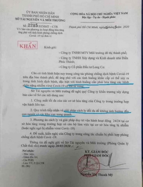 Ngày 23/3/2020, Sở Tài nguyên – Môi trường Tp HCM ra văn bản khẩn số 2285/STNMT-CTR do Phó Giám đốc Sở Nguyễn Thị Thanh Mỹ ký với nội dung chuẩn bị tinh thần cho việc ứng phó khẩn cấp với dịch do corona Virus gây ra.