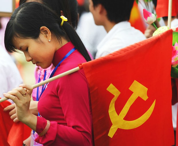 Một thiếu nữ cầm cờ cộng sản sau khi tham dự một cuộc diễu hành quân sự được tổ chức vào 10 tháng 10, 2010 tại Hà Nội