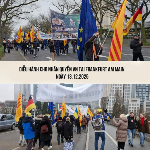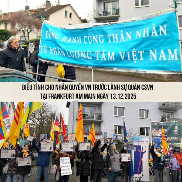 Hôm 13.12.2025, đông đảo người Việt tại CHLB Đức đã tụ tập trước Lãnh sự quán CSVN tại Kennedy Alle 49 - Frankfurt am Main để tham dự cuộc biểu tình mang chủ đề “Đồng hành cùng thân nhân Tù nhân Lương tâm – Chống đàn áp xuyên quốc gia”do Liên Hội Người Việt tại CHLB Đức tổ chức với sự hỗ trợ của tổ chức ACAT Đức (Hành động của Các Kitô hữu Chống tra tấn) và Tổ chức Quốc tế Chống án Tử hình.